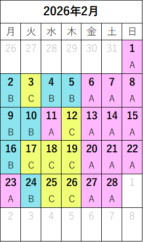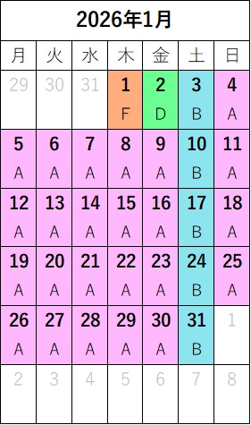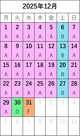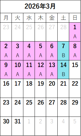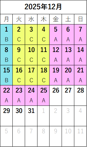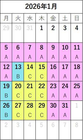 高速バス運賃カレンダー(基本旅行代金はB期間 A期間370円増/C期間300円減/S期間設定なし)