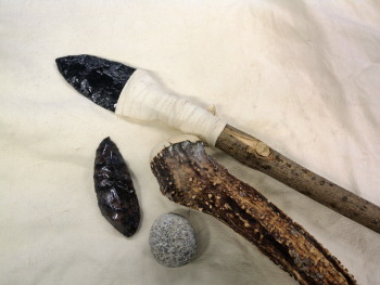 黒曜石を鹿の角でうすく割りながら、ヤリの先につける尖頭器(せんとうき)をつくります。めざせ!石器づくり名人。※製作は石器のみで柄の部分は含まれておりません