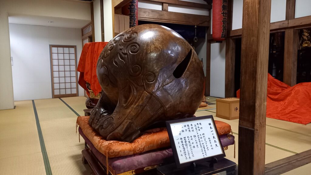 国内最大級と言われる直径約1.35メートル、重さ約330キロの巨大木魚。継ぎ目のない一本のクスノキをくり抜いて作られています。